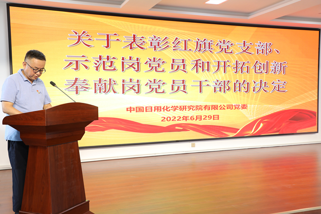 黨委書(shū)記、院長(zhǎng)耿濤為獲獎(jiǎng)黨支部、黨員干部頒獎(jiǎng)。院黨委號(hào)召獲獎(jiǎng)支部和黨員在今后的工作中不辱使命,不負(fù)眾望,發(fā)揮戰(zhàn)斗堡壘和先鋒模范的旗幟作用,和全體黨員一道帶動(dòng)全院職工為日化院改革創(chuàng)新和高質(zhì)量發(fā)展貢獻(xiàn)更高智慧和更大力量,共創(chuàng)日化院的更大輝煌。會(huì)議由中國(guó)日化院黨委委員、紀(jì)委書(shū)記張小旦主持。