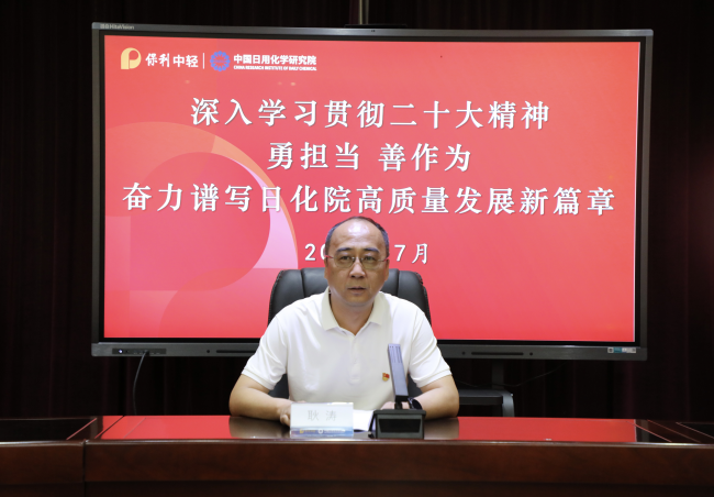 會上,黨委書記、院長耿濤以《深入學(xué)習(xí)貫徹二十大精神 勇?lián)?dāng) 善作為 譜寫日化院高質(zhì)量發(fā)展新篇章》為題,生動講授了主題黨課。黨課結(jié)合二十大報告及習(xí)近平總書記關(guān)于擔(dān)當(dāng)作為的重要指示批示精神,講述了中國共產(chǎn)黨人擔(dān)當(dāng)作為的革命歷史和政治品格,同時聯(lián)系日化院實際,深刻闡述了什么是擔(dān)當(dāng)作為、為什么要擔(dān)當(dāng)作為、如何擔(dān)當(dāng)作為之間的關(guān)系。耿濤書記強(qiáng)調(diào),黨員干部要甘于擔(dān)責(zé)、樂于擔(dān)事、勇于擔(dān)錯、善于擔(dān)難、敢于擔(dān)險,培養(yǎng)擔(dān)當(dāng)?shù)挠職夂湍芰ΑK赋觯聲r代新征程,黨員干部要做到信念過硬、責(zé)任過硬、能力過硬、作風(fēng)過硬、立足新時代,完成新使命。他號召全體黨員干部要在上半年取得超額完成預(yù)算目標(biāo)好成績的基礎(chǔ)上,繼續(xù)擔(dān)當(dāng)作為,腳踏實地、埋頭苦干,把思想和行動統(tǒng)一到黨的二十大精神和習(xí)近平總書記重要指示批示精神上來,心往一處想,勁往一處使,為完成全年任務(wù)目標(biāo),建設(shè)具有一流核心競爭力的科研院所努力奮斗。