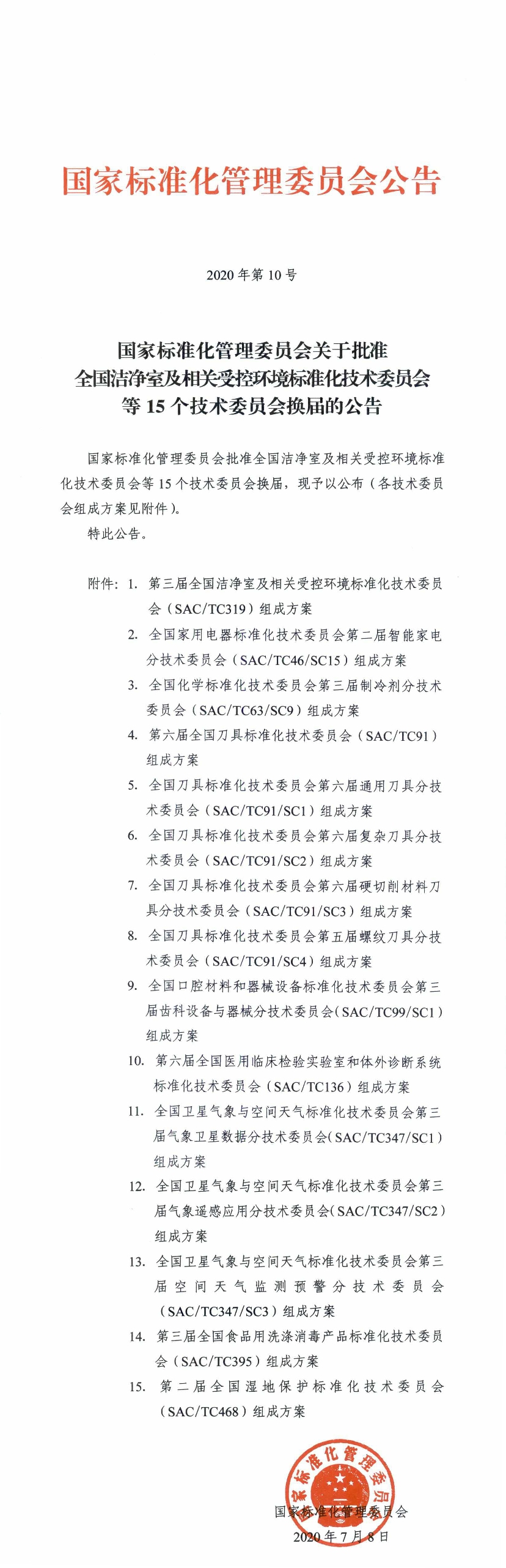 2020年7月8日,國(guó)家標(biāo)準(zhǔn)化管理委員會(huì)發(fā)布2020年第10號(hào)公告《國(guó)家標(biāo)準(zhǔn)化管理委員會(huì)關(guān)于批準(zhǔn)全國(guó)潔凈室及相關(guān)受控環(huán)境標(biāo)準(zhǔn)化技術(shù)委員會(huì)等15個(gè)技術(shù)委員會(huì)換屆的公告》,批復(fù)第三屆全國(guó)食品用洗滌消毒產(chǎn)品標(biāo)準(zhǔn)化技術(shù)委員會(huì)(SAC/TC395)組成方案。本屆技術(shù)委員會(huì)由44名委員組成,中國(guó)日化院為秘書處承擔(dān)單位。