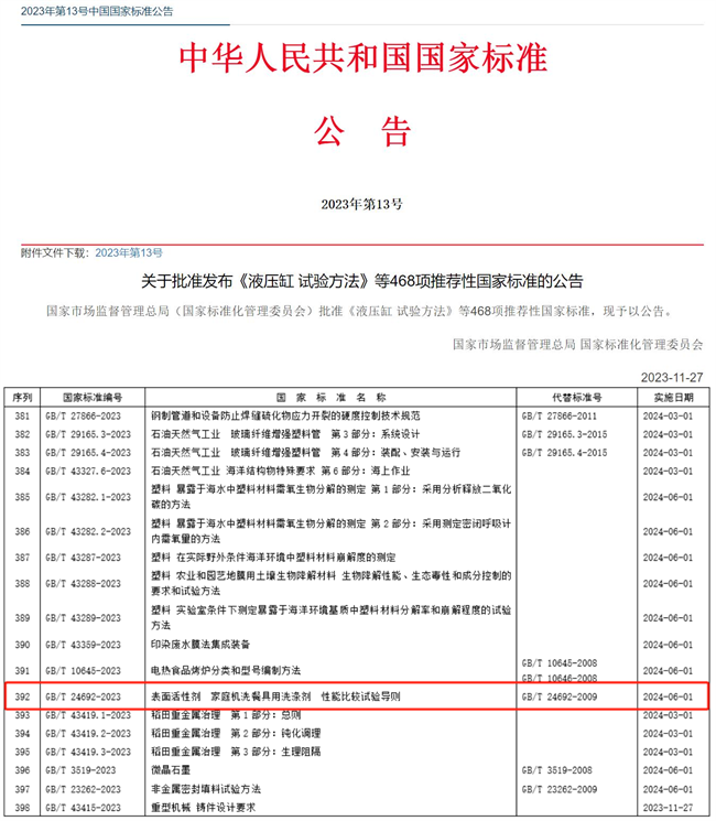 2023年11月27日,國(guó)家市場(chǎng)監(jiān)督管理總局(國(guó)家標(biāo)準(zhǔn)化管理委員會(huì))發(fā)布2023年第13號(hào)標(biāo)準(zhǔn)公告《關(guān)于批準(zhǔn)發(fā)布<液壓缸 試驗(yàn)方法>等468項(xiàng)推薦性國(guó)家標(biāo)準(zhǔn)的公告》,批準(zhǔn)發(fā)布了468項(xiàng)推薦性國(guó)家標(biāo)準(zhǔn)。其中,GB/T 24692-2023《表面活性劑 家庭機(jī)洗餐具用洗滌劑 性能比較試驗(yàn)導(dǎo)則》由全國(guó)表面活性劑和洗滌用品標(biāo)準(zhǔn)化技術(shù)委員會(huì)歸口管理,中國(guó)日用化學(xué)研究院主導(dǎo)起草,2024年6月1日實(shí)施,代替GB/T 24692-2009。