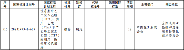近日,《國家標準化管理委員會關(guān)于下達2023年第三批推薦性國家標準計劃及相關(guān)標準外文版計劃的通知》(國標委發(fā)〔2023〕58號)發(fā)布。全國表面活性劑和洗滌用品標準化技術(shù)委員會歸口的《洗滌劑中乙二胺四乙酸(EDTA)、氮川三乙酸(NTA)和二乙烯三胺五乙酸(DTPA)的測定 高效液相色譜法》標準經(jīng)專家評審及公示,獲批立項。