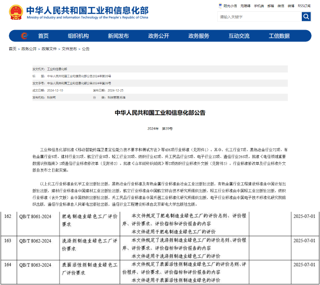 三項標準將于2025年7月1日起實施。日化領域綠色工廠標準的發(fā)布健全了表面活性劑和洗滌用品標準體系,為日化領域綠色產業(yè)升級提供了技術支撐。