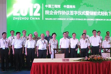 8月10日,中國(guó)工程院、湖南省人民政府、中國(guó)南車在湖南株洲舉辦中國(guó)工程院和中國(guó)南車院企合作協(xié)議簽字儀式暨儲(chǔ)能式輕軌車下線典禮。合作雙方將在“戰(zhàn)略咨詢服務(wù)、合作研發(fā)和成果轉(zhuǎn)化、科技合作與交流活動(dòng)、高端科技人才引進(jìn)和培養(yǎng)”等方面開(kāi)展合作。國(guó)務(wù)院有關(guān)部門參加了簽字儀式,國(guó)資委副主任黃丹華出席并致辭。