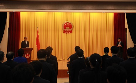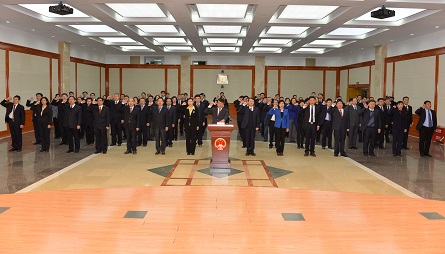2017年3月8日上午,國務(wù)院國資委舉行首次憲法宣誓。國資委副主任、黨委委員劉強同志監(jiān)誓,人事局局長莊樹新同志主持宣誓儀式。國資委機關(guān)、監(jiān)事會和有關(guān)離退休干部局共計85名局處級干部進行了憲法宣誓。宣誓儀式上,全體宣誓人員高唱中華人民共和國國歌,并面向國旗、國徽,向憲法莊嚴宣誓,表明了忠于憲法、遵守憲法、維護憲法、依法履職盡責的決心。