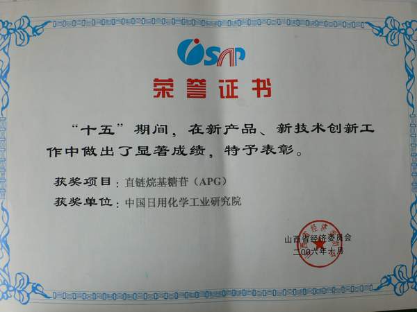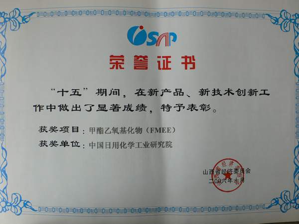 ????為總結(jié)表彰“十五”期間為山西省企業(yè)技術(shù)創(chuàng)新工作做出成績(jī)的組織和個(gè)人,進(jìn)一步推動(dòng)“十一五”企業(yè)技術(shù)創(chuàng)新工作向更高水平發(fā)展,山西省經(jīng)委對(duì)“十五”期間企業(yè)技術(shù)創(chuàng)新團(tuán)隊(duì),新產(chǎn)品、新技術(shù),技術(shù)創(chuàng)新管理優(yōu)秀工作者、先進(jìn)個(gè)人進(jìn)行了表彰。其中中國(guó)日化院“甲酯乙氧基化物( FMEE)”和“直鏈烷基糖苷( APG)”兩個(gè)項(xiàng)目獲得新產(chǎn)品、新技術(shù)貢獻(xiàn)獎(jiǎng)。