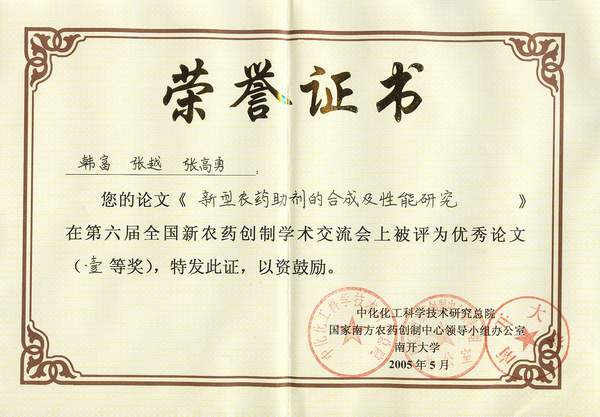 ??? 繼我院的技術(shù)研發(fā)工作于 2004年進(jìn)入國家農(nóng)藥攻關(guān)計(jì)劃之后,2005年又傳佳音:在第六屆全國新農(nóng)藥創(chuàng)制學(xué)術(shù)交流會(huì)上,我院韓富、張?jiān)健埜哂峦咀珜懙恼撐摹缎滦娃r(nóng)藥助劑的合成及性能研究》被評為優(yōu)秀論文一等獎(jiǎng),與上海有機(jī)所呂龍教授的論文并列獲此榮譽(yù)。會(huì)議由中化化工科技研究總院和國家南方農(nóng)藥創(chuàng)制中心組辦,我院獲獎(jiǎng)?wù)撐膬?nèi)容是由張高勇院士負(fù)責(zé)的國家農(nóng)藥攻關(guān)專題的部分研究成果,說明我院在該領(lǐng)域的研究工作被農(nóng)藥行業(yè)充分認(rèn)可并受到關(guān)注。