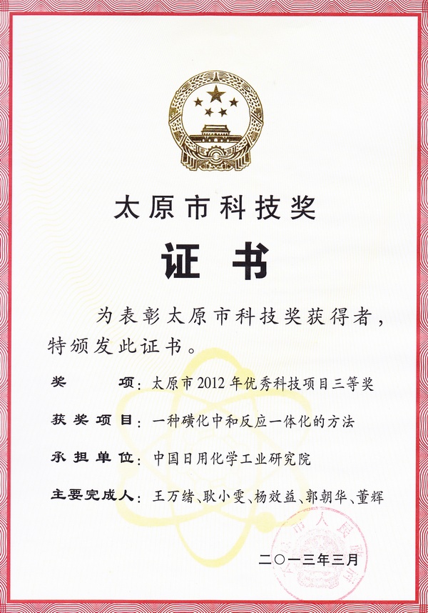 2013年3月2日上午,二○一三年全市科技工作會議在市政府舉行,會議對二○一二年度科技工作先進(jìn)單位、先進(jìn)個人和優(yōu)秀科技項(xiàng)目進(jìn)行了表彰獎勵。我院承擔(dān)的太原市科技計(jì)劃項(xiàng)目“一種磺化中和反應(yīng)一體化的方法”獲太原市優(yōu)秀科技項(xiàng)目三等獎。