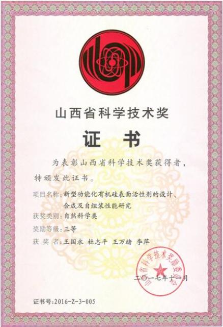 其研究成果包括:在國(guó)際上率先提出在離子液體的疏水鏈中引入短鏈支鏈硅氧烷能降低其熔點(diǎn)并提高其聚集能力的觀點(diǎn);在國(guó)際上率先提出在糖基表面活性劑的疏水鏈中引入短鏈支鏈硅氧烷能誘導(dǎo)其形成囊泡的新觀點(diǎn);構(gòu)筑了糖基有機(jī)硅表面活性囊泡體系和糖基有機(jī)硅表面活性農(nóng)藥微乳體系。自2009年以來(lái),該小組研究成果在膠體與界面科學(xué)領(lǐng)域主流期刊如Langmuir、J. Phys. Chem. B、Colloids Surf. A和J.Ind.Eng.Chem等發(fā)表論文近三十篇,其中部分論文選為封面;在SIS、IACIS、中國(guó)化學(xué)會(huì)年會(huì)和中國(guó)化學(xué)會(huì)膠體與界面化學(xué)會(huì)議等國(guó)內(nèi)外重要會(huì)議做邀請(qǐng)和口頭報(bào)告13次。該成果先后榮獲第四屆亞洲膠體與界面科學(xué)會(huì)議“優(yōu)秀墻報(bào)獎(jiǎng)”、第十七屆山西省優(yōu)秀學(xué)術(shù)論文一等獎(jiǎng)、第十八屆山西省優(yōu)秀學(xué)術(shù)論文二等獎(jiǎng)、2016年度山西省自然科學(xué)三等獎(jiǎng)、2015和2017年中國(guó)日用化學(xué)品優(yōu)秀科技論文評(píng)選二等獎(jiǎng)等獎(jiǎng)項(xiàng),其核心技術(shù)獲得三項(xiàng)發(fā)明專(zhuān)利授權(quán)。