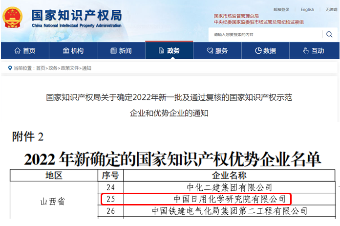 2022年10月27日,國家知識產(chǎn)權(quán)局發(fā)布《國家知識產(chǎn)權(quán)局關(guān)于確定2022年新一批及通過復核的國家知識產(chǎn)權(quán)示范企業(yè)和優(yōu)勢企業(yè)的通知》(國知發(fā)運函字〔2022〕160號)文件,中國日用化學研究院有限公司(以下簡稱“中國日化院”)成功入選2022年度新一批國家知識產(chǎn)權(quán)優(yōu)勢企業(yè)。