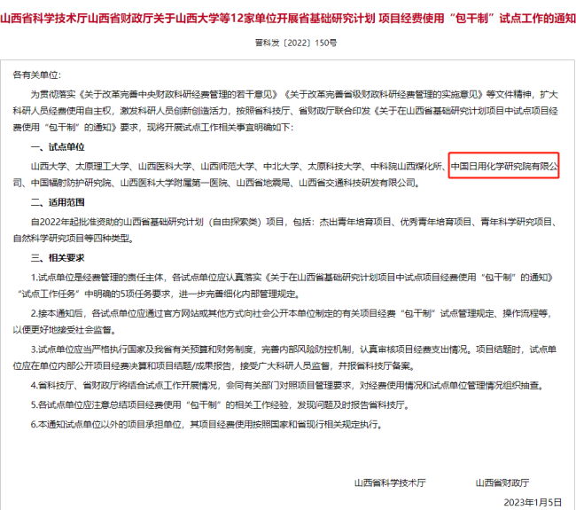 日前,山西省科學技術(shù)廳發(fā)布《山西省科學技術(shù)廳山西省財政廳關(guān)于山西大學等12家單位開展省基礎(chǔ)研究計劃項目經(jīng)費使用“包干制”試點工作的通知》(晉科發(fā)〔2022〕150號)文件,中國日化院獲批成為試點單位。