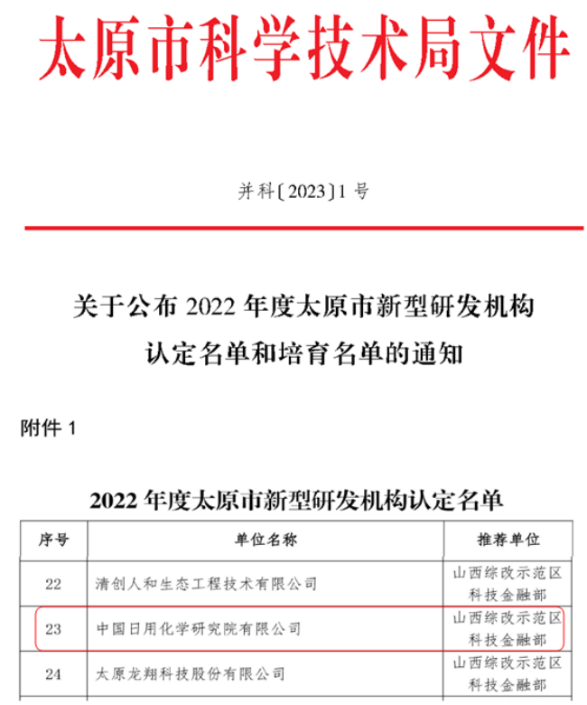 2023年1月6日,太原市科學(xué)技術(shù)局發(fā)布《關(guān)于公布2022年度太原市新型研發(fā)機構(gòu)認(rèn)定名單和培育名單的通知》(并科〔2023〕1號),中國日化院被認(rèn)定為“2022年度太原市新型研發(fā)機構(gòu)”。本次認(rèn)定,標(biāo)志著中國日化院在科技創(chuàng)新領(lǐng)域的發(fā)展進(jìn)程再次取得新的突破!