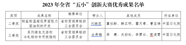 近日,由山西省總工會、共青團山西省委和山西省科學技術協(xié)會聯(lián)合舉辦的2023年全省“五小”創(chuàng)新大賽評選結(jié)果揭曉。由中國日化院報送的“耐鹽耐溫超低界面張力驅(qū)油劑的開發(fā)”和“系列綠色無溶劑冷軋鋼材專用脫脂劑”兩個項目均榜上有名,分別獲得優(yōu)秀成果二等獎和三等獎。