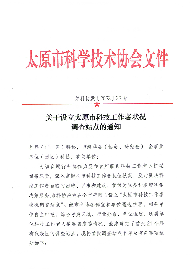 近期,太原市科學(xué)技術(shù)協(xié)會(huì)發(fā)布《關(guān)于設(shè)立太原市科技工作者狀況調(diào)查站點(diǎn)的通知》(并科協(xié)發(fā)〔2023〕2號(hào)),中國(guó)日用化學(xué)研究院被太原市科學(xué)技術(shù)協(xié)會(huì)確定為市級(jí)科技工作者狀況調(diào)查站點(diǎn)。