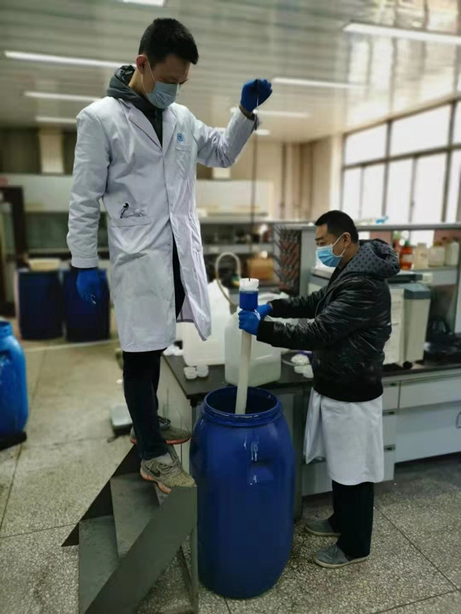 與此同時,日化院利用自身在消毒用品研發(fā)和配制方面的優(yōu)勢,組織科研人員配制高濃度消毒液并向周邊單位發(fā)放,積極投入到聯(lián)防聯(lián)控的工作中,為保障阻斷疫情做出貢獻。王國永、臺秀梅、白艷云、關(guān)勁松、冀創(chuàng)新等科研生產(chǎn)人員積極響應(yīng),為抓緊時間配置消毒液,他們平時操作鼠標(biāo)和試劑瓶的雙手,此刻抬起了上百公斤的原料桶……很快消毒液陸續(xù)發(fā)往集團公司、省科技廳、知識產(chǎn)權(quán)局、市科技局、街辦、社區(qū)、濱河小學(xué)、三十七中等單位。“沒有什么困難,我住的近,隨時能到單位”當(dāng)問到有什么困難時,重點實驗室關(guān)勁松同志這樣說。截至目前他經(jīng)手發(fā)放的消毒原液可配置100余噸消毒劑。