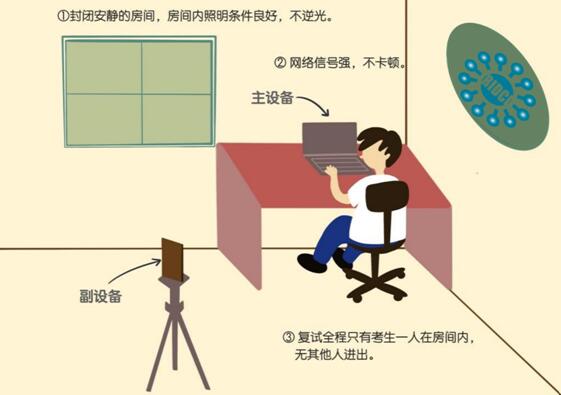 復(fù)試時(shí)需要1臺(tái)主設(shè)備和1臺(tái)副設(shè)備,設(shè)備可以用手機(jī)、平板或電腦。主設(shè)備用于近距離視頻復(fù)試,副設(shè)備用于監(jiān)控復(fù)試場(chǎng)所。