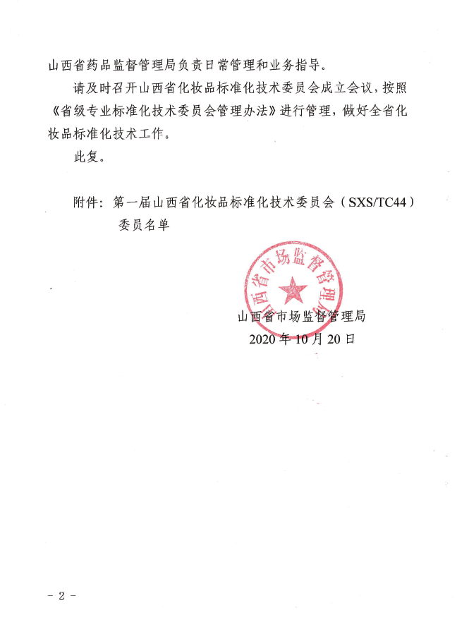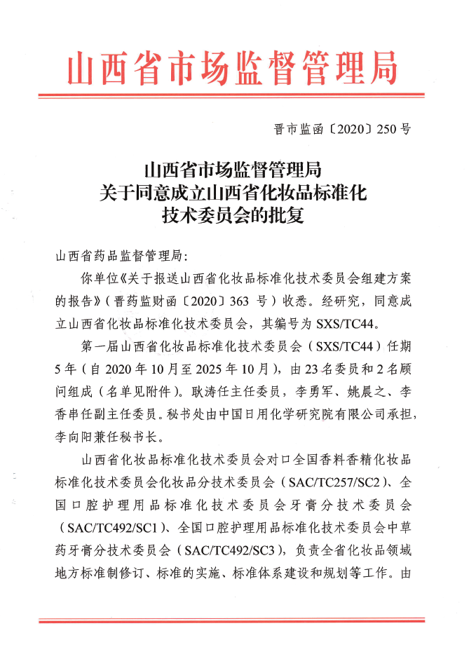 《關(guān)于同意成立山西省化妝品標(biāo)準(zhǔn)化技術(shù)委員會的批復(fù)》文件