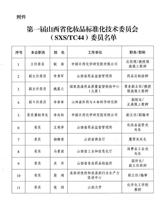為山西省化妝品標(biāo)準(zhǔn)化技術(shù)委員會、第一屆山西省化妝品標(biāo)準(zhǔn)化技術(shù)委員會