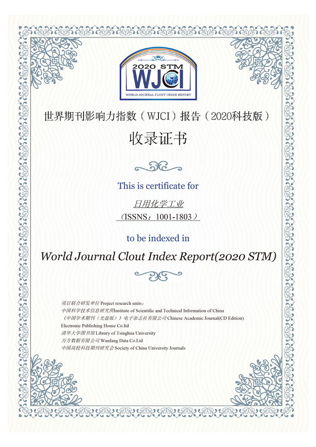 經(jīng)嚴(yán)格評(píng)議,目前《WJCI報(bào)告》共收錄全球科技期刊14287種,其中收錄中國(guó)科技期刊1426種,覆蓋246個(gè)學(xué)科。《日用化學(xué)工業(yè)》被收錄于“化學(xué)工業(yè)一般性問(wèn)題”學(xué)科,本學(xué)科共收錄全球期刊42種,其中中國(guó)大陸期刊僅收錄6種,《日用化學(xué)工業(yè)》位列收錄中國(guó)大陸期刊的第4位。入選《WJCI報(bào)告》的期刊均被認(rèn)為是具有地區(qū)代表性和學(xué)科代表性的優(yōu)秀期刊,這對(duì)提升期刊的學(xué)術(shù)影響力和國(guó)際傳播力具有重要意義。