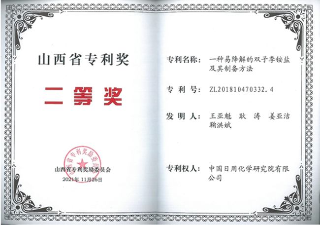 2021年11月26日,山西省專利獎(jiǎng)勵(lì)委員會(huì)對(duì)2021年度第三屆山西省專利獎(jiǎng)獲得者進(jìn)行了表彰,中國(guó)日化院“一種易降解的雙子季銨鹽及其制備方法”(國(guó)家發(fā)明專利,專利號(hào)ZL201810470332.4)喜獲山西省專利獎(jiǎng)二等獎(jiǎng),充分彰顯了日化院在促進(jìn)技術(shù)創(chuàng)新和構(gòu)筑自主知識(shí)產(chǎn)權(quán)體系的核心優(yōu)勢(shì)。