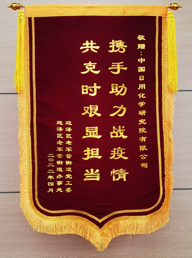 2022年5月19日,中國日化院收到老軍營街道黨工委和辦事處聯(lián)合授予的錦旗,表彰日化院在抗疫過程中所做的工作。過去近一個月的時間里,太原市經(jīng)歷了嚴(yán)峻的疫情防控考驗(yàn)。疫情為令,防控?fù)?dān)責(zé),中國日化院黨委在加強(qiáng)自身防疫管理,保持科研經(jīng)營有序推進(jìn)的同時,做好聯(lián)防聯(lián)控,支援駐地抗疫工作,為取得疫情防控阻擊戰(zhàn)和生產(chǎn)經(jīng)營攻堅(jiān)戰(zhàn)的雙勝利奠定了良好的基礎(chǔ)。