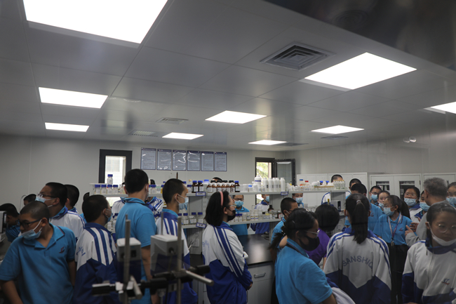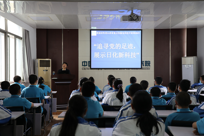 活動(dòng)期間,太原市第三十七中學(xué)近百名學(xué)生分兩批來(lái)院參觀,觀看科普展板,觀摩科研成果,參觀實(shí)驗(yàn)儀器,聽取中國(guó)日化院應(yīng)用技術(shù)創(chuàng)新中心副主任臺(tái)秀梅博士進(jìn)行的表面活性劑知識(shí)科普講座。講座以中國(guó)共產(chǎn)黨領(lǐng)導(dǎo)的科技創(chuàng)新為主線,結(jié)合日常生活場(chǎng)景,綜述了表面活性劑基礎(chǔ)知識(shí),揭示了許多蘊(yùn)藏在生活中的科學(xué)理論;以科學(xué)家精神和對(duì)未知領(lǐng)域的不斷探索為落腳點(diǎn),激發(fā)了同學(xué)們對(duì)科學(xué)探索的興趣,幫助其樹立起投身科研自立自強(qiáng)的遠(yuǎn)大志向。