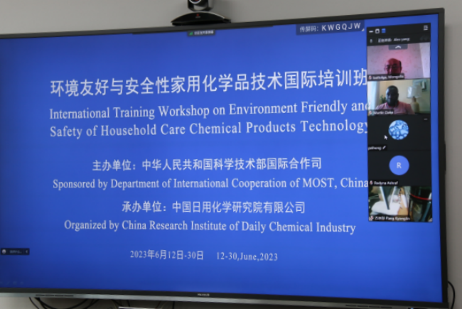 由中華人民共和國科學技術(shù)部國際合作司主辦、中國日用化學研究院有限公司承辦的2020年度發(fā)展中國家技術(shù)培訓項目“環(huán)境友好與安全性家用化學品技術(shù)國際培訓班”于2023年6月12日下午在山西省太原市中國日用化學研究院有限公司開幕,本次培訓班承辦單位中國日用化學研究院有限公司的主要領(lǐng)導和參加本次培訓班的全體外籍學員線上出席開幕儀式。中國日用化學研究院有限公司副院長程寧致開幕詞,他祝賀本次培訓班順利籌備和開幕,并代表中國日用化學研究院有限公司歡迎和感謝各位外籍學員積極參加培訓。中國日用化學研究院有限公司副院長孫永強為外籍學員們進行了題為《表面活性劑技術(shù)發(fā)展及未來需求分析》的線上授課。來自印尼、贊比亞、蒙古、孟加拉等國家的學員代表先后發(fā)言,他們對于能夠參加培訓向中國政府表示感謝,并共同祝愿本次培訓能夠取得圓滿成功。