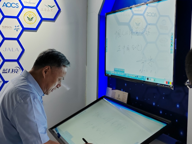 在參觀日化院院史館后,辛忠教授題寫了“中國(guó)人的體面生活在中國(guó)日化”的贈(zèng)言,鼓勵(lì)日化院為“美好生活的貢獻(xiàn)者”而努力奮斗。
