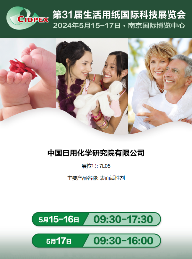 應(yīng)主辦方中國制漿造紙研究院邀請(qǐng),中國日用化學(xué)研究院將參加2024年5月15日—17日在南京國際博覽中心舉辦的第31屆生活用紙國際科技展覽會(huì),展位號(hào):7L05。