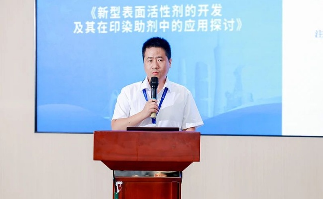 劉曉臣博士作《新型表面活性劑的開發(fā)及其在印染助劑中的應(yīng)用探討》報告