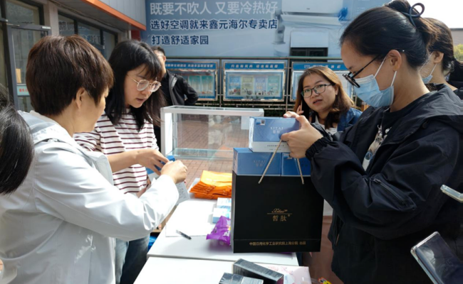 社區(qū)居民在工作人員組織下試用中國(guó)日化院自主品牌“皙肽”修護(hù)嫩膚和煥顏靚膚系列個(gè)人護(hù)理產(chǎn)品,感受植物精華萃取物、深海提取物和小分子水解肽為肌膚帶來(lái)的柔嫩護(hù)膚效果。