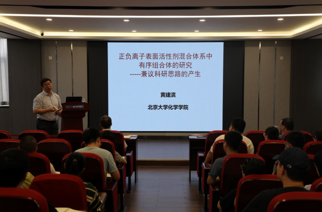 會議期間,全體與會代表受邀在中國日化院進行了集體參觀,期刊主編、北京大學黃建濱教授還受邀為中國日化院全體研發(fā)人員做了《正負離子表面活性劑混合體系中有序組合體的研究——兼談科研思路的產生》的專題學術講座。